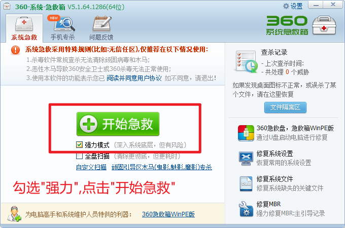 勾选"强力",点击"开始急救"